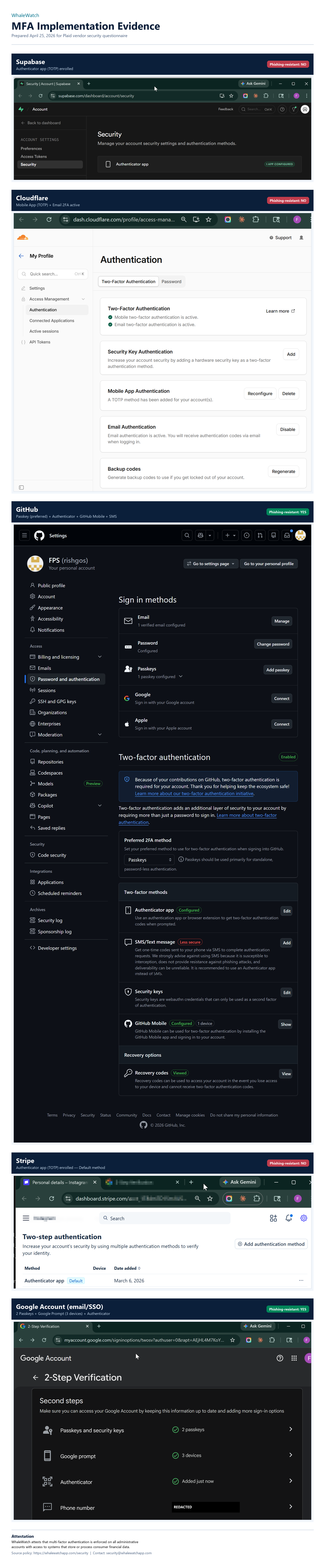 - MFA on every administrative account. Supabase, Cloudflare, GitHub, Stripe, Plaid (production), and the underlying email account each enforce multi-factor authentication. See the MFA Implementation Evidence exhibit for the current factor inventory.